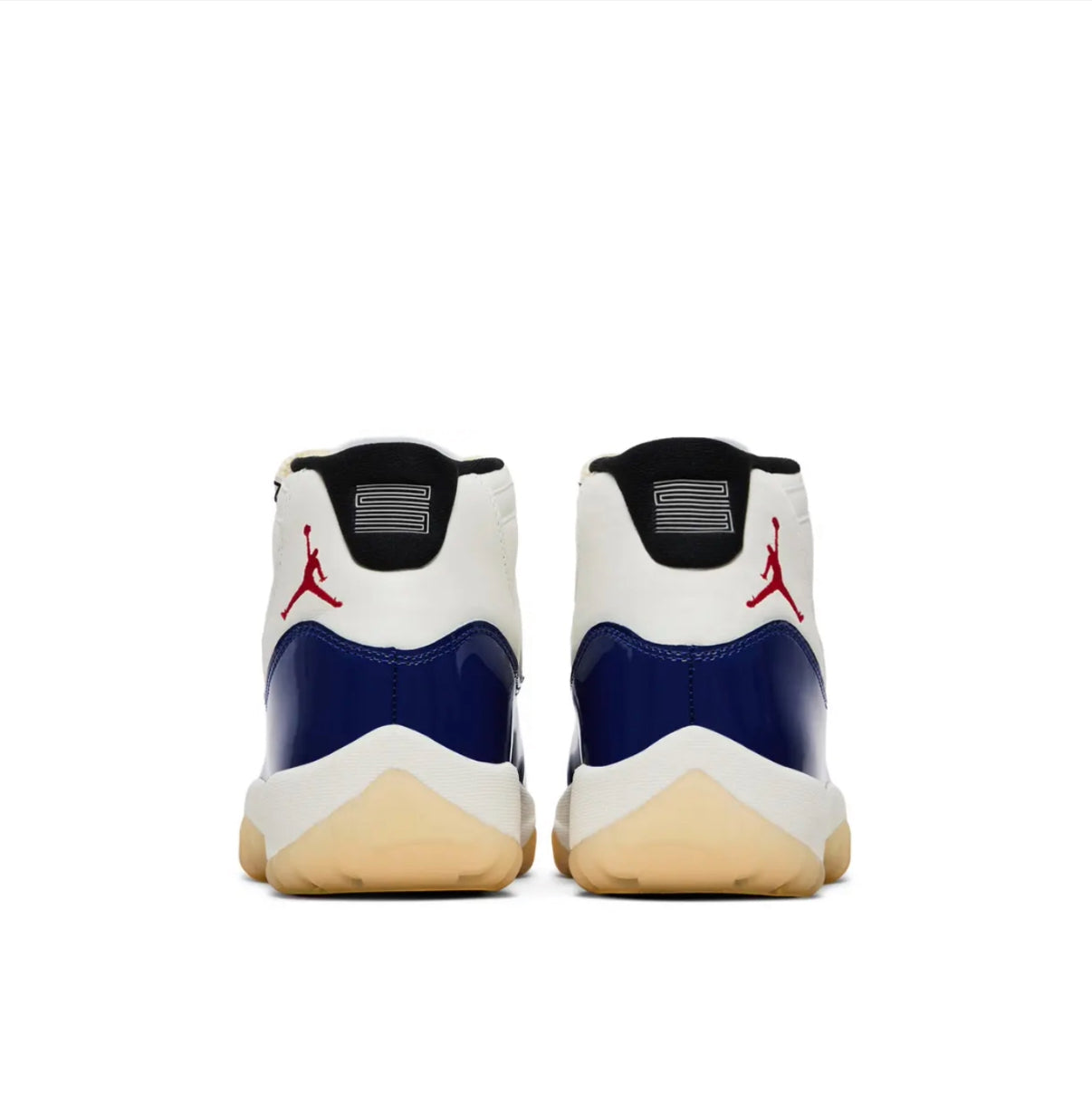 The Air Jordan 11 Retro 'Rare Air' features a white leather upper with a shiny patent leather mudguard in Deep Royal Blue. In addition to a crimson Jumpman logo on the lateral collar, branding elements include 'JORDAN' spelled out on the webbing eyelets and a stylized '23' stamped on the black textile back tab. Lightweight cushioning arrives via a Phylon midsole, fitted with full-length Air-sole cushioning and supported by a translucent rubber outsole.