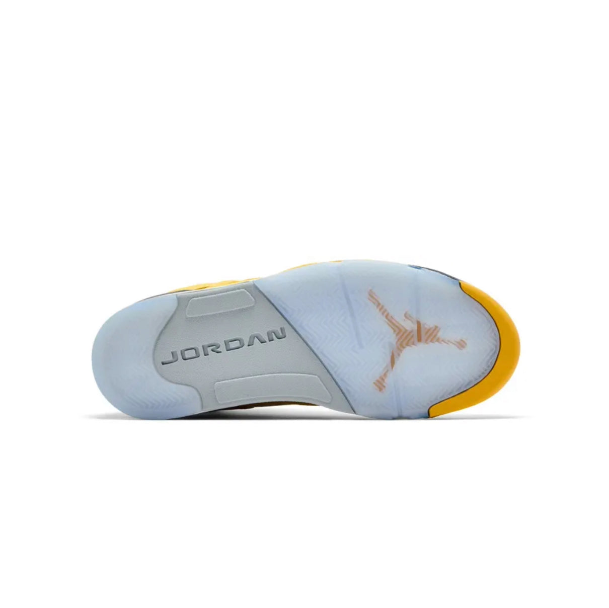 The 2025 edition of the Air Jordan 5 Retro T23 'Tokyo' revives a 2011 limited release that dropped exclusively in Japan. Like the original, this reissue sports a bright yellow nubuck upper with translucent quarter panel netting and grey molded eyelets. A Jumpman logo adorns the silver reflective tongue in black embroidery, matching the textile collar lining, stylized '23' on the lateral heel, and the second Jumpman icon that adorns the back heel.